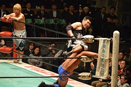 日高郡司にドロップキック(右写真)、場外に落とす。