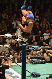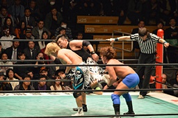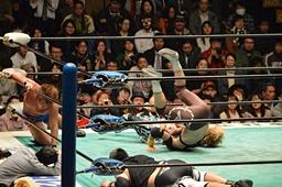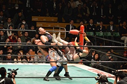 佐々木が藤田を肩に担ぎ、郡司がコーナーから飛んで合体式のデスバレーボム(左写真)。