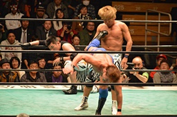 日高は2人を激突させると郡司の首を取って佐々木にキック(右写真)、
