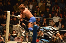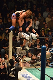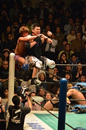 藤田が抱え上げ、日高がコーナーに上って佐々木の首を抱え込む(左写真)、