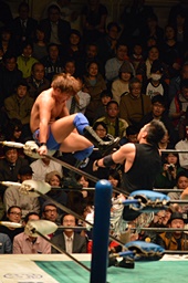 日高佐々木をコーナーに振って串刺しエルボー(右写真)、