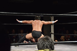 丸山ロープに飛ぶ、イサミは勇脚(右写真)、カウント1。