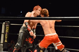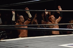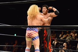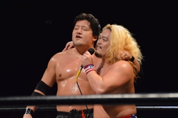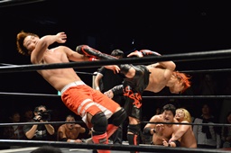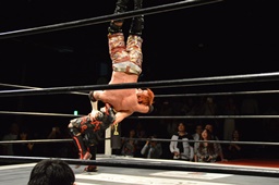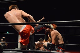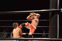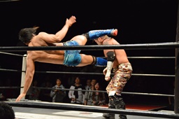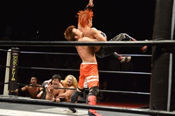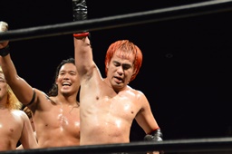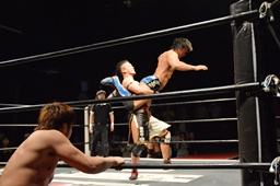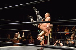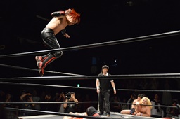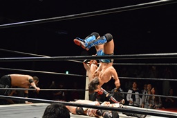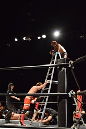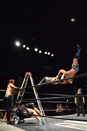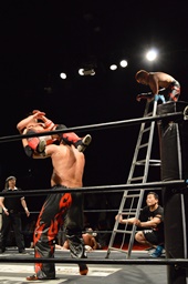 そこにイサミがラダーからのダイビングダブルニードロップ(右写真)、カウント3。