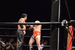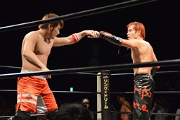 イサミと中津がフィストバンプ(左写真)、打撃戦開始。