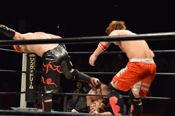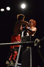 彰人が関根をラダーの上に河津落とし(右写真)。