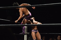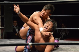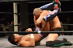 遠藤梅田をコーナーに詰めて逆水平連打。ボディスラムから変形キャメルクラッチ(左写真)。