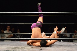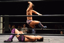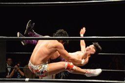 梅田コーナーに振ってジャンピングキック(左写真)、エプロンに出てスワンダイブミサイルキック。