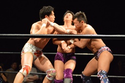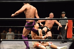 遠藤がシューティングスタープレス(左写真)、梅田がカット。竹下が梅田を場外に出す。