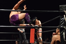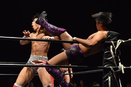 竹下ロープに振る、梅田セカンドロープに飛び乗って反転ミドルキック(右写真)、関根にタッチ。5分経過。