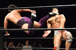 梅田ロープに飛ぶ、竹下カウンターのゼロ戦キック(右写真)、遠藤にタッチ。