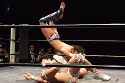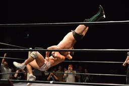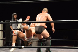竹下ロープに押し込んでジャーマン狙う、梅田ブロック、竹下抱え上げてブルーサンダー(左写真)、カウント2。