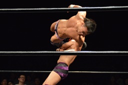 関根遠藤をターンバックルに投げつけ、対角線コーナーに振って突っ込む、遠藤カウンターのキック。遠藤エプロンに出るとトップロープに飛び乗り(左写真)スワンダイブエルボー。