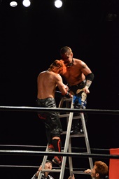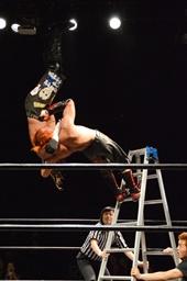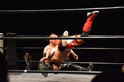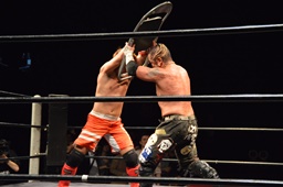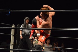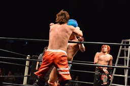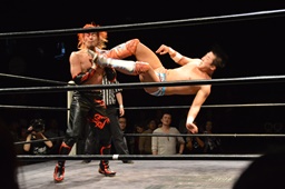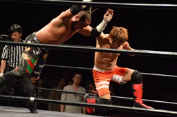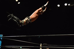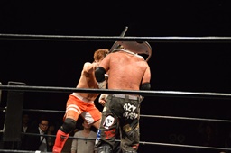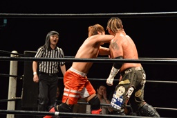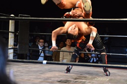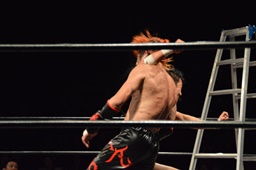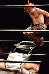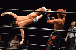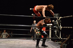 イサミロープに飛ぶ、風戸フランケンシュタイナー(左写真)、イサミ場外転落。