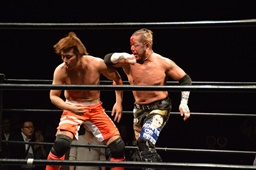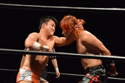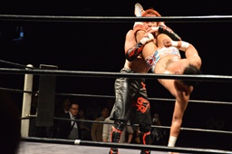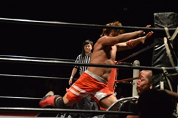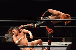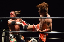 風戸がイサミにドロップキック(右写真)