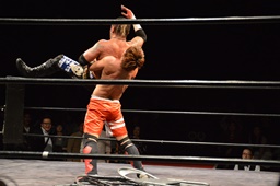 イサミすぐさまアックスボンバーで返す(左写真)。