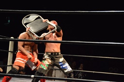垂直落下式ブレーンバスター(右写真)、カバーはイサミがカット。