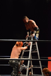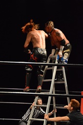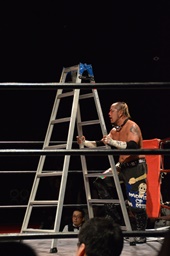 葛西がラダーをリングに立てて上る(左写真)、