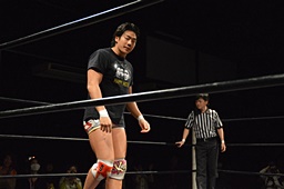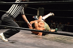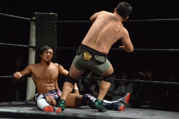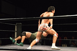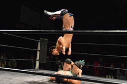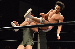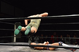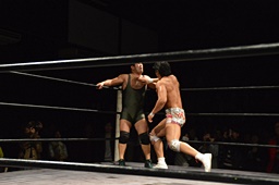 小林コーナーからダイブ、竹下ガットショット。竹下ロープに飛ぶ、小林ヘビーローテーション(左写真)。
