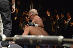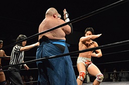 遠藤その場跳びシューティングスタープレス、植木はヒザを立ててブロック(左写真)、
