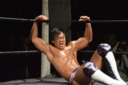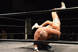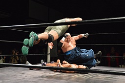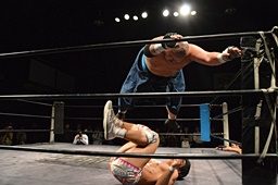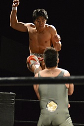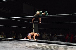 コーナーに上ってダイビングクロスボディ(右写真)、小林にタッチ。