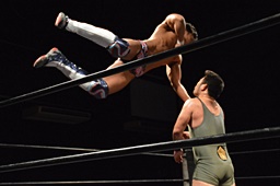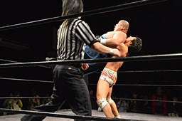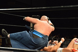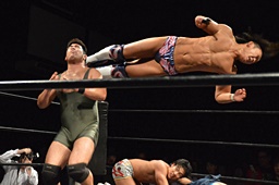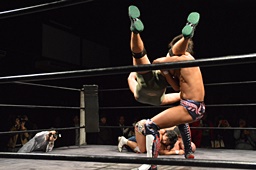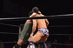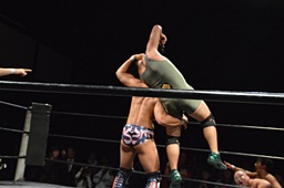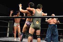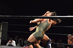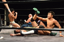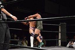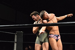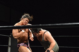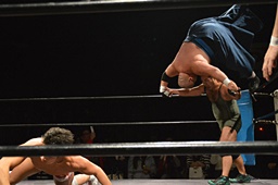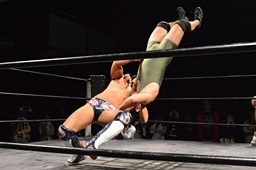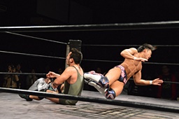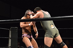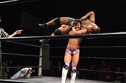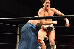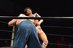 竹下切り返してジャーマン狙う、小林ブロック(左写真)。