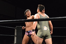竹下ラリアット、小林かわしてバック取る(右写真)、