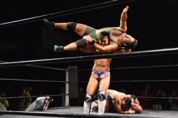 遠藤ロープに飛ぶ、植木追走してボディアタック(右写真)。