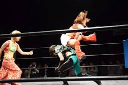 坂崎が山下に飛びついてコルバタ(右写真)、山下場外転落。坂崎は場外に向けて魔法少女ダイブ。
