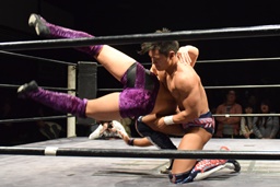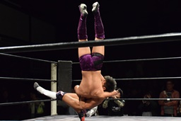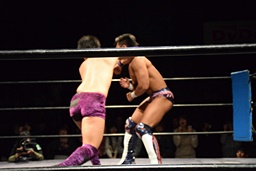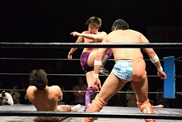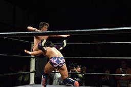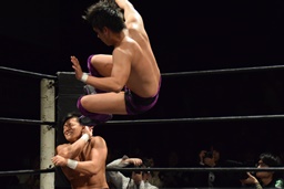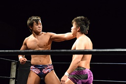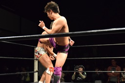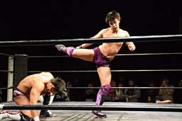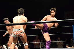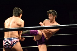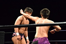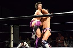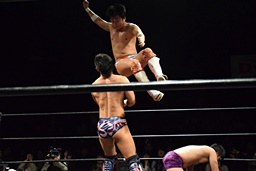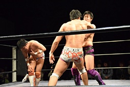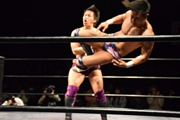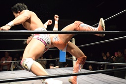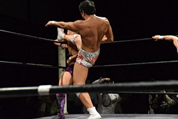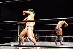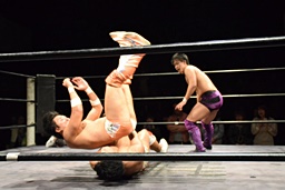 梅田が梅田ドライバー(仮)狙う、竹下が阻止。竹下エルボー(左写真)、