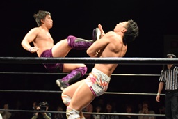 ロープに飛ぶ、遠藤カウンターのドロップキック(右写真)。