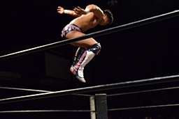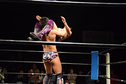 風戸竹下をコーナーに振って突っ込む、竹下カウンターのラリアット(右写真)。