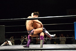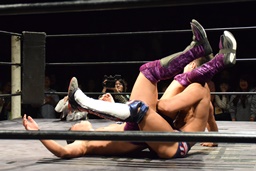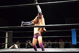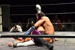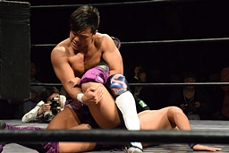 遠藤逆エビ固めから片逆エビ固め(左写真)、梅田ロープ。15分経過。