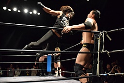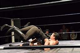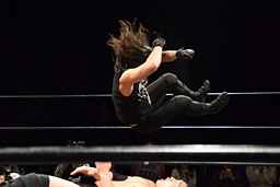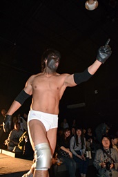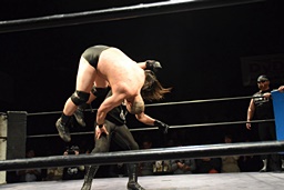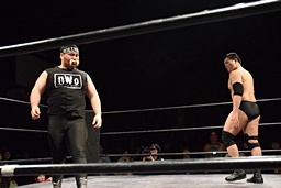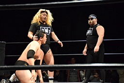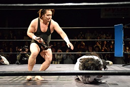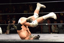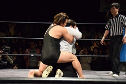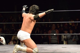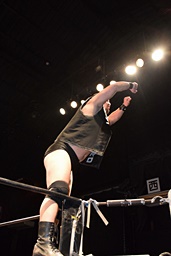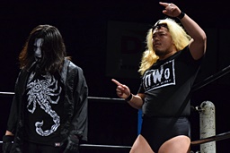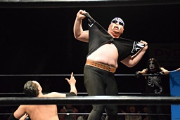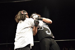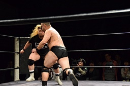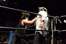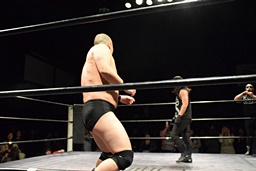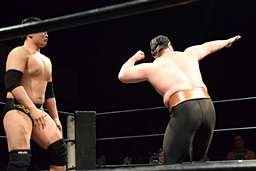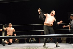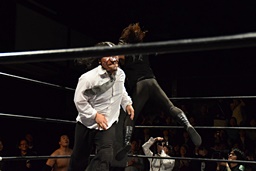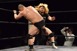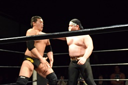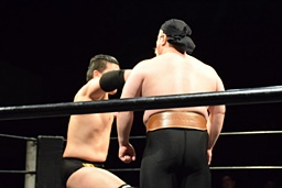 相撲ロックはガットショット、DDT(左写真)、リューイチンにタッチ。練馬も福田にタッチ。