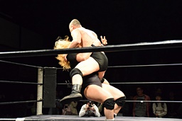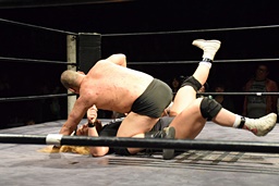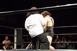 相撲ロックガットショット、ロープに飛ぼうとするがホーガソはその背中をひっかく(左写真)