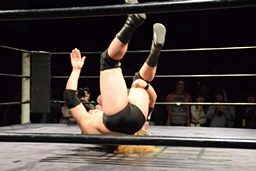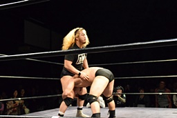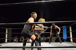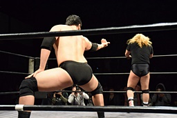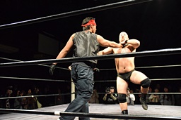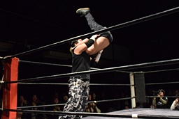 練馬がロックにガットショット、スコーピオンデスドロップ狙うが相撲ロックは切り返してロックボトムの体勢に、福田が阻止(左写真)。