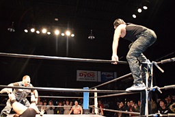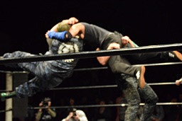 ディーヴォンっぽいのがコーナーから福田の股間へのダイビングヘッドバット(右写真)。