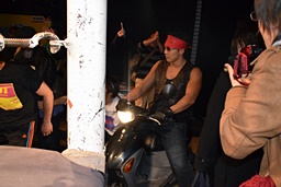 そこにバイクの轟音が響き、アメリカン・バッドアスっぽい誰かが入場(左写真)。
