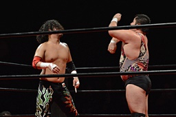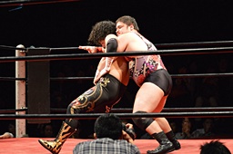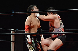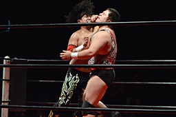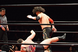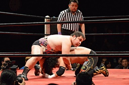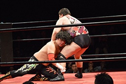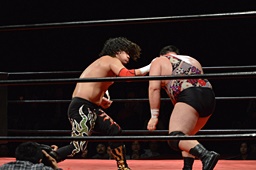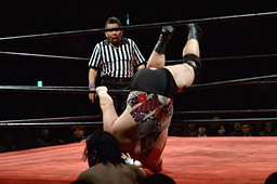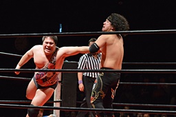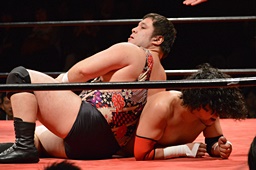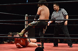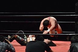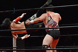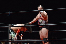引き起こしてネックブリーカードロップ(左写真)、アントンカウント1で返す。