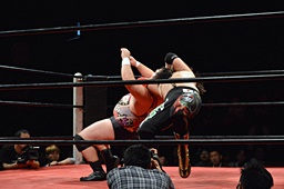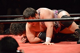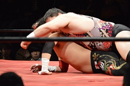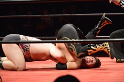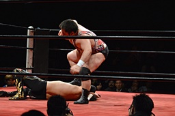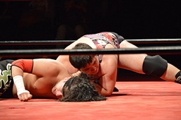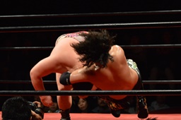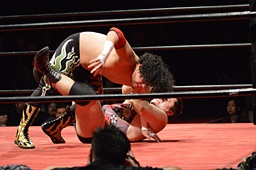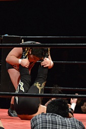 久保ゴロースープレックス狙うがアントン切り返してスコーピオンデスドロップの体勢に(右写真)