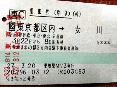 きっぷは東北新幹線・東北本線・石巻線経由の東京−女川往復。
