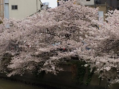 西中洲まで歩いてホテルに荷物預ける。途中の中洲の桜。木によってはまだ満開。