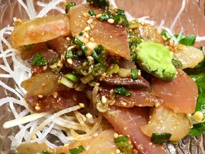 試合後バスで駅まで戻り、居酒屋「七福心」で夕食。ヒラスの刺身。