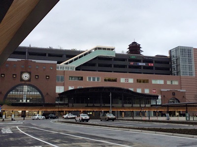 17時ホテルを出てまず真新しい駅ビルに。郷土料理を食べられそうな店は満席。しかたないので「だるま」でラーメン。