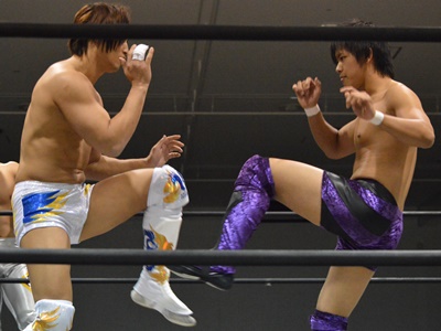 遠藤が今日の試合中ケブラーダの際に足を骨折したということで明日から福田が参戦、と。