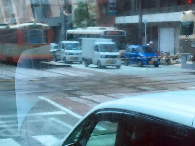 7時25分発のANAは予定の9時より前に松山空港に着。9時発のバスに乗れた。大手町の十字交差を見ると松山に来た感。