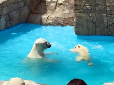 カワウソは寝てたのでまずはホッキョクグマに。4月来た時にはプール怖がってた赤ちゃんが泳いでた。
