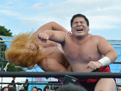 小湊駅には11時53分着。「夏の魔物」対応でタクシーが列をなしていた。「帰り呼んだら来てもらえますか?」と聞くと運転手「ピストン輸送してるから駐車場に絶対いるよ。」駐車場には10分弱で着く。そこからリングまではちょっと歩く。リングとメインステージが花道で結ばれていて、メインステージが終わらないと試合始まらない様子。