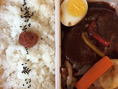 朝食は「国産牛ハンバーグ弁当」。こういうのにするのは珍しいかも。