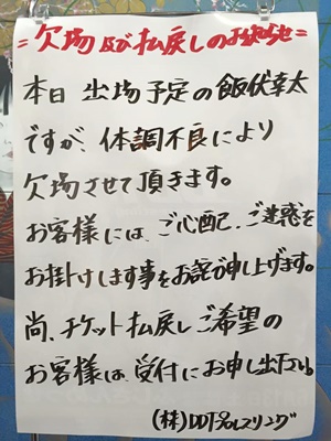 飯伏、今日も欠場。昨日の時点では「寝坊?」という疑惑もあったが、2日連続、しかも直前発表とあっては気になる。