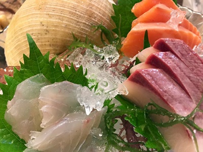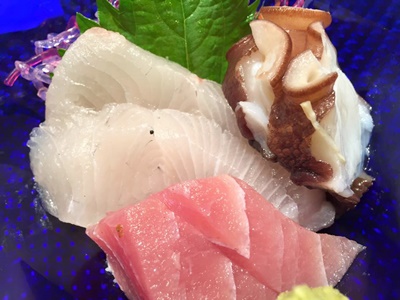 バスで岡山駅に戻り、地下の炉ばた焼き屋「八閣」で晩酌セット。刺身。